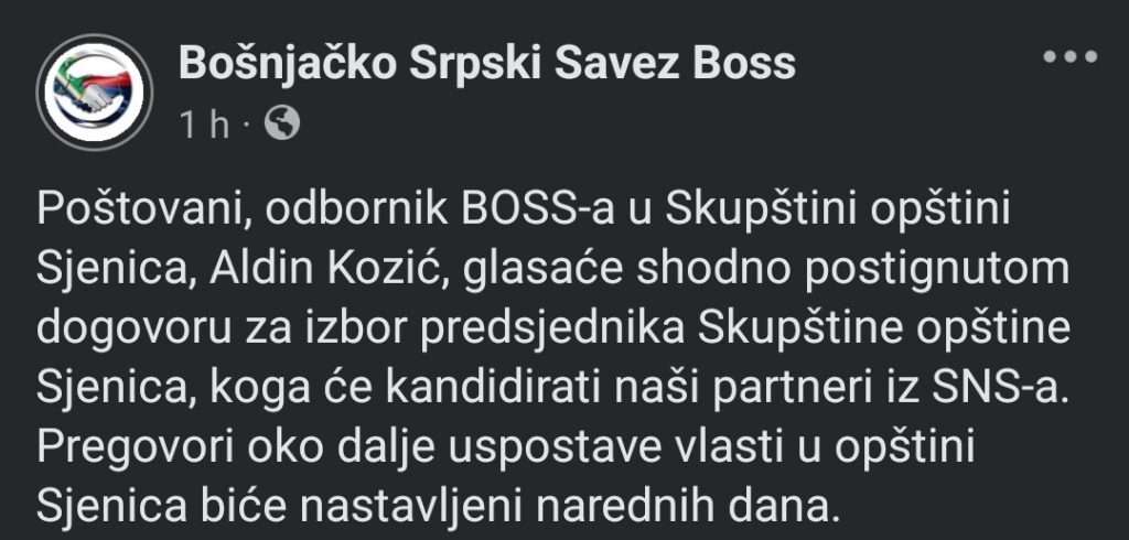Na zvaničnoj stranici Bošnjačko-srpskog saveza koji u Sjenici ima jednog odbornika objavili su da njihov kandidat će dati podršku izboru predsjednika Skupštine opštine Sjenica koji će biti iz redova SNS-a i da će o potencijalnoj koaliciji razgovarati se narednih dana!