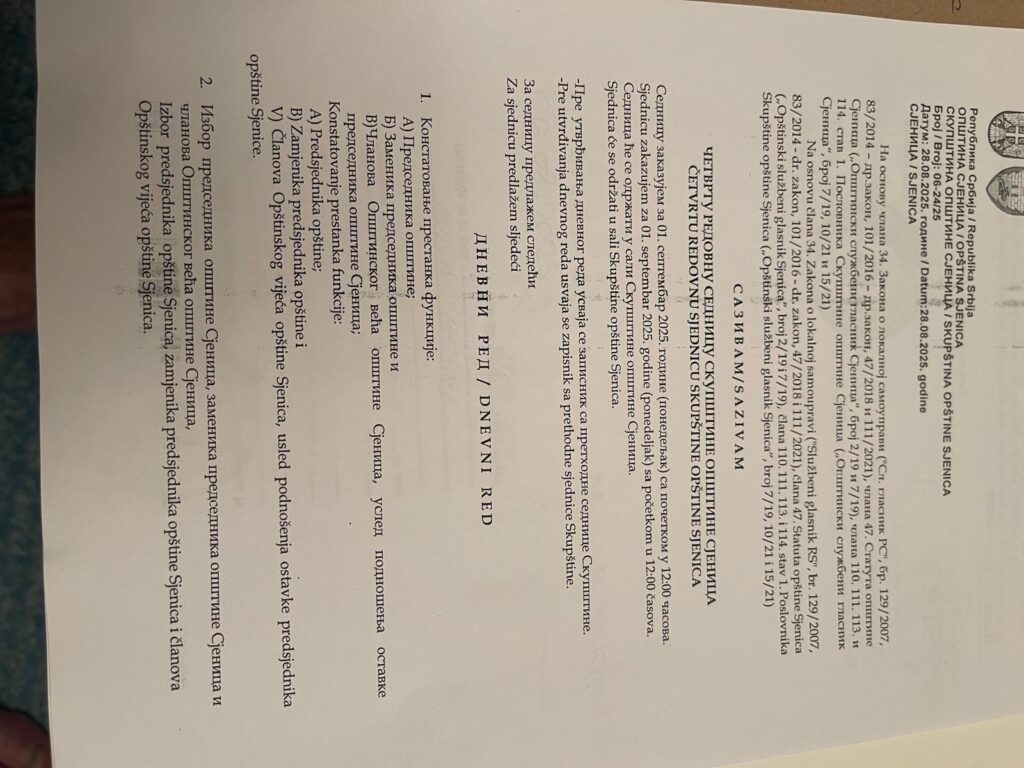 U ponedeljak 01.09. zakazana je sjednica SO Sjenica na kojoj je jedina tačka dnevnog reda a to je ostavka dosadašnjeg predsjednika opštine Muniba Mujagića, zamjenika kao i cijelokupnog Opštinskog vijeća!